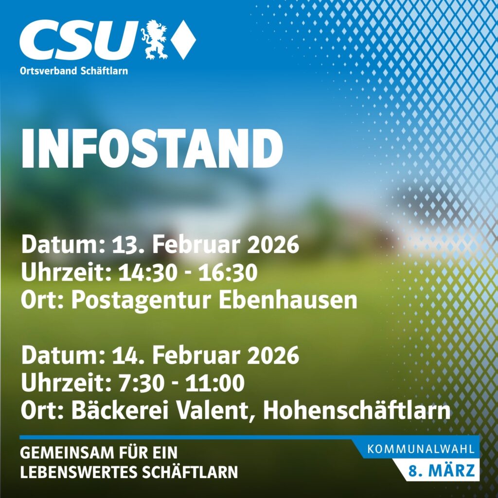 - Samstag, 14.02.2026, „Am Valentinstag beim Valent“, 07:30 Uhr bis 11 Uhr. Sie erhalten von den Kandidatinnen und Kandidaten der CSU-Schäftlarn/Liste1 vor der Bäckerei Valent an der Schorner Straße in Hohenschäftlarn eine kleine Überraschung.